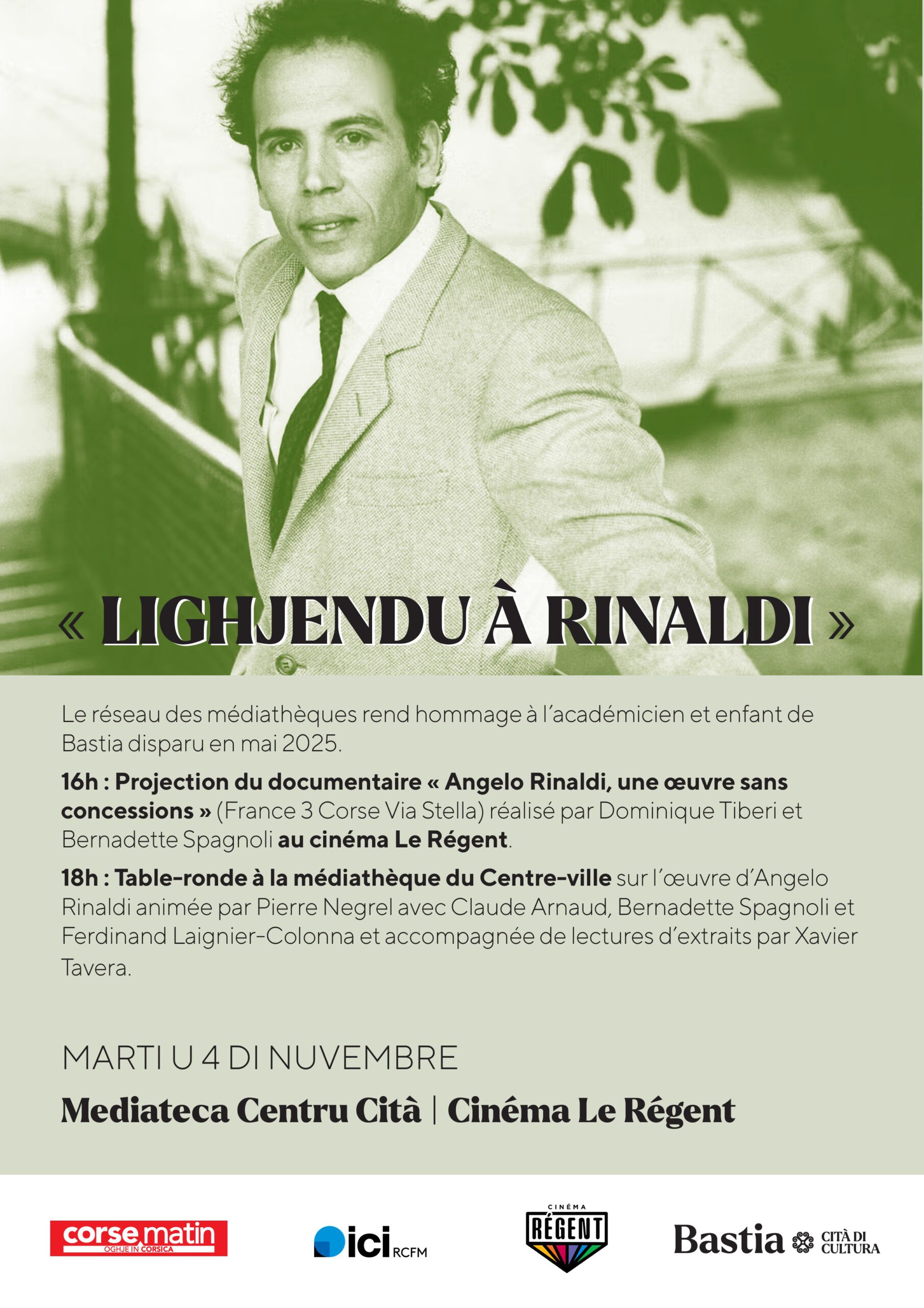 Le mardi 4 novembre 2025, un hommage sera rendu à Angelo RINALDI dans sa ville natale de BASTIA. Claude ARNAUD participera à 18 heures à une table ronde animée par Pierre NEGREL dans la Méditathèque du centre-ville, rue Favalelli, en compagnie de Bernadette SPAGNOLI, co-réalisatrice d’un documentaire consacré à l’écrivain qui sera lui-même projeté à 16 heures au cinéma LE REGENT, et de Ferdinand LAIGNIER-COLONNA. Pour en