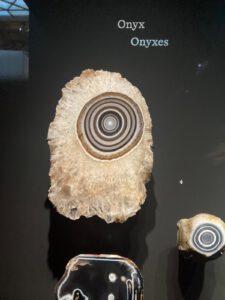 … » Rêveries de pierres », l’exceptionnelle exposition des minéraux et de gemmes de la collection personnelle de l’écrivain Roger CAILLOIS (1913-1978) à l’Ecole des Arts Joailliers, sise à l’Hôtel de Mercy-Argenteau, 16 bld Montmartre, 75002 Paris. C’est un ensemble inoubliable de pièces d’onyx, de quartz, d’agates, de jaspes, de labradorites… où la main humaine n’est intervenue que pour les trancher et les polir, et qui démontrent l’inépuisable génie formelle de la nature : certaines évoquent un ciel ennuagé, d’autres des villes fortifiées, d’autres des sexes